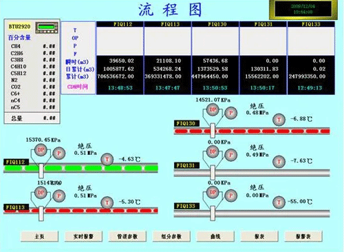 ①实时数据显示:系统在工作过程中实时的显示仪表检测到的关键数据。此画面中显示了共计5条管线的实时数据,包括瞬时流量、累计流量、压力、差压、温度和仪表时钟。