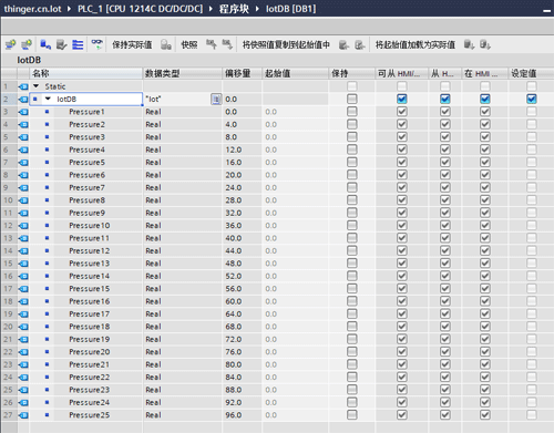 然后创建一个DB块,取名为IotDB,DB号为DB1,添加一个Iot结构体变量,如下图所示: