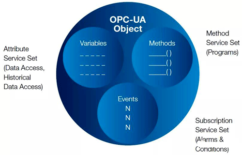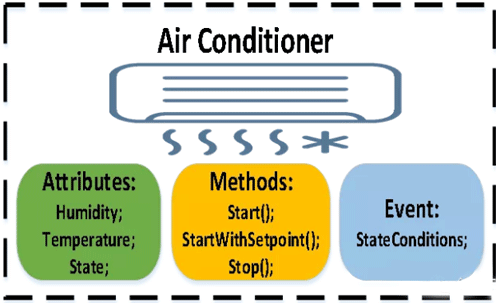 假设在工业现场有若干台空调需要监控,首先我们需要监视它的温度,湿度,运行状态;其次我们需要对它进行启停操作;然后我们需要接受它的非停事故报警信息;最后我们常常需要分析某一时段的运行参数来判断空调的状态。运用面向对象编程的思想,我们创建一个类—空调,在这个类中分别定义相应的属性,方法和事件,其中属性即可以是简单的数据,也可以是复杂的结构体。这个类即可理解成OPC UA的信息模型。OPC UA将现场的这些实时数据(DA),历史数据(HDA)还有事故报警数据(A&E),在同一平台进行管理,即为统一架构。