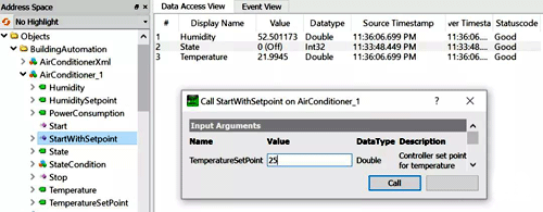 用这种模式来通讯,效果怎么样呢?下面我们做一个简单的演示。在unified automation公司出品的demo server中,已经定义了若干个空调,我们通过该公司出品的客户端UA Expert进行监视。在菜单栏的左侧,列出了该空调的属性,方法和事件;在右侧中,这里只是监视空调的温度,湿度和运行状态。这时,空调是停止(OFF)状态。如果需要将空调启动,并将运行目标温度设定为比较舒服的25℃,只需要调用StartWithSetpoint方法,并在对话框中输入目标值即可。