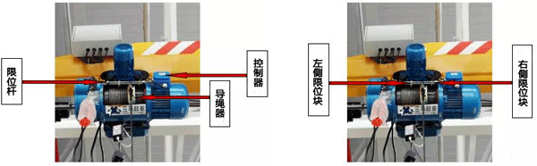 这是由断火限位器和葫芦钢丝绳上的导绳器共同决定的:断火限位器是双向限位:左边是推分常闭触头,右侧是拉分常闭触头。