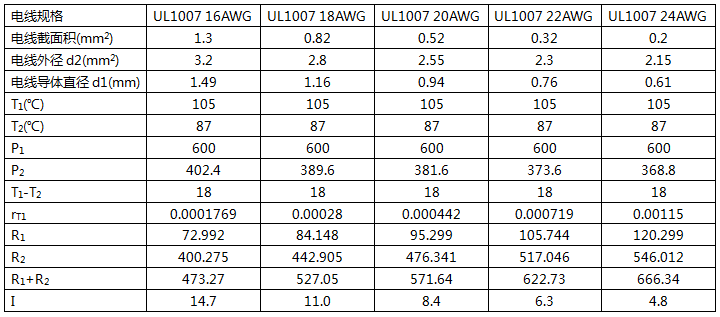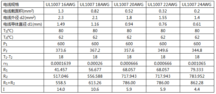 我们先以温升18度时的电流进行计算。由于JASO D609的计算公试是以最高工作温度减去环境温度的方法来表示温升的。所以,我们设定UL1007电线的最高工作温度是80度,环境温度为62度,此时,最大温升为18度时的电流承载能力如下表。