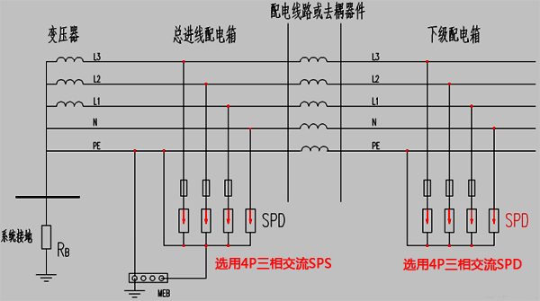 ②TN-S系统,从总配电箱开始就要装设4P三相交流电源SPD(推荐型号为YR9000PB-40/320-4P)。