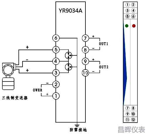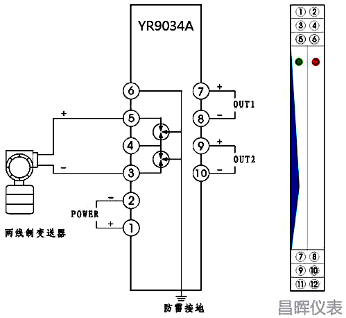 如下图所示,二线制仪表没有单独的供电电源,需要隔离器给仪表供电,然后仪表再反馈电流信号给信号隔离器输入端。所以,将现场仪表的电源线接在隔离器5脚上,反馈信号线接在3脚上。