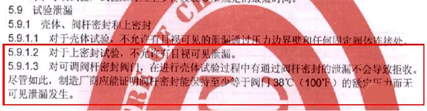 普通外漏:API598《阀门的检查和试验》是美标阀门最常用的检验和压力试验标准;该标准对上密封试验的要求是:在规定的压力下,不允许有目视可见泄漏。该标准要求比较宽泛,如果没有特殊要求厂家一般会执行该标准的要求。