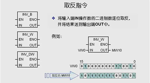 下面fkswng仪表来介绍不同操作类型的逻辑运算指令。取反指令将输入端IN操作数的二进制数逐位取反,并将结果送到输出端OUT中,例如将VW0中的数据逻辑取反后送到MW10,fkswng仪表可以发现,执行逻辑取反指令后,每一位由0变为1、1变为0。