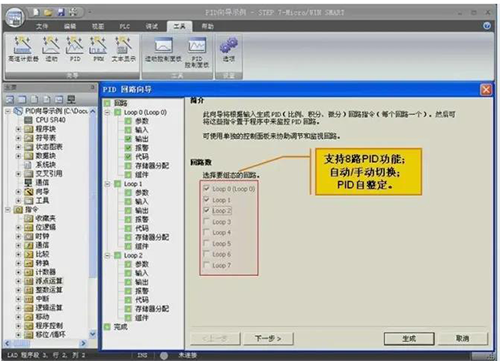 配置PID向导。在工具菜单功能区单击PID按钮打开PID回路向导对话框,选择要组态的回路,最多可组态8个回路,这里我们选择回路0。