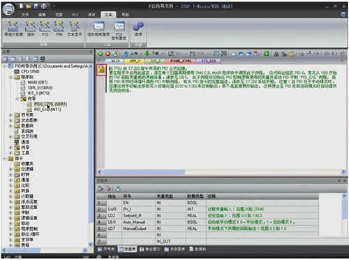 查看向导生成的项目组件。在项目树中展开程序块下的向导文件夹,双击初始化PID子程序打开,该子程序是加密的,可以查看相关的子程序调用说明,变量表列出了子程序的接口参数定义,编程调用时可参考。双击PID功能中断子程序打开,该中断子程序也是加密的,请注意PID向导使用了定时中断0,编程时不能再使用此中断,否则会引起PID运行错误。