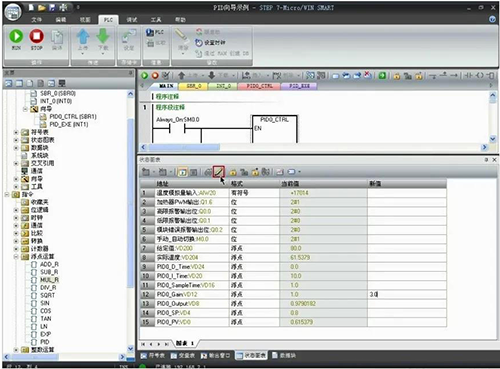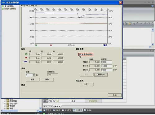 在工具菜单功能区单击PID控制面板按钮,打开PID整定控制面板对话框,选择回路0,先启动手动调节,输入PID参数,如增益改为5.0,单击更新CPU,使新输入的参数值起作用,监视趋势图,根据调节状况改变PID参数直至调节稳定,即过程值与设定值接近,且输出没有不规律的变化,并最好处于控制范围中心附近,此时可将手动调节改为自动调节,即自整定。