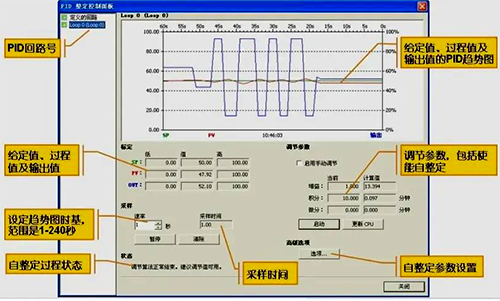 自整定。要使用PID控制面板必须与CPU通信,用PID向导配置生成一个PID回路,并将程序下载到CPU中,使CPU处于运行模式,在状态图表中将给定值设为60度,PID控制改为自动模式。