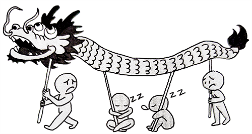 图1 本来龙尾巴这一头的控制指令可以通过一个人、一个人往下传,控制整个舞龙动作的,但中间有两个人开小差,这龙就舞不起来了,换句话说,不可控了