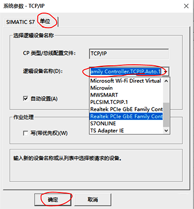 3、右键“TCP/IP”-“系统参数”-“单位”-选择自已电脑的网卡Auto.1-“确定”