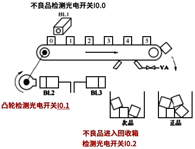 如图1所示:在传送带上有“0”“1”“2”“3”“4”“5”总共6个工位。机械手把产品放在第“0”个工位上,通过光电开关(或者视觉)检测。当机械手每放入一个产品,传送带移动一个工位。当传送带每移动一个工位凸轮转一圈(I0.1检测到一个信号)。当检测到不良品时,到达第“4”个工位气缸推出。当不良品(次品)掉入箱体里,I0.2将检测到一个信号从而气缸可以缩回。