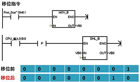 如图2,SHL_B为左移位指令,IN指的是需要移位的操作数,而N则代表移位的个数。程序中VB0的初始值为2进制的00000001,左移一位后最高位丢失,整体左移一位,最低位补0,则变成2进制的00000010。
