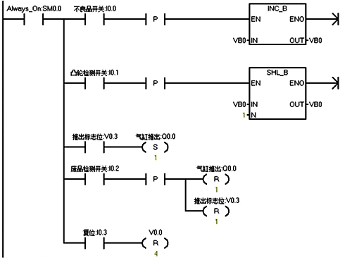 2、当第N个产品移动了4次后,VB0中的V0.3位为1,而产品刚好到达第“4”号工位,Q0.0为1,气缸推出。当第N+1个产品移动了4次后,VB0中的V0.3位为1,而产品刚好到达第“4”号工位,Q0.0为1,气缸推出。