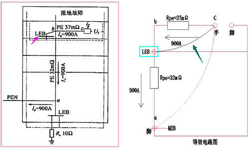 可知c和LEB之间只有一个PE支线电阻37mΩ,根据欧姆定律c-LEB之间电位差为900×37/1000=33.3V<50V安全电压。
