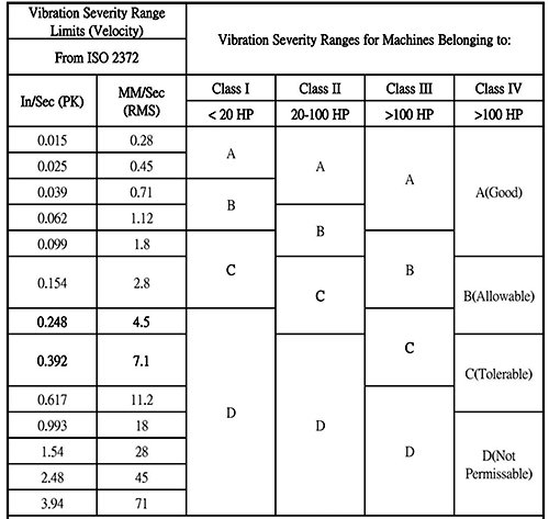 在表格中不难发现,左边列出了振动烈度的单位,包括速度有效值和位移峰值。