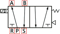 我们以两位五通单电控电磁阀为例,看看其端口说明,分别是A、B、R、P、S,所以是五通,那么这个就是两位五通电磁阀。P代表进气孔,就是输入端,A和B都是出气孔,P和A是长通,P和B是常断,R是A的排气孔,S是B的排气孔。当电磁阀线圈不通电时,把P孔接上气源,A孔出气,当A孔出气时,B孔与S孔相通用于排气,当B孔出气时,A孔和R孔相通用于排气。