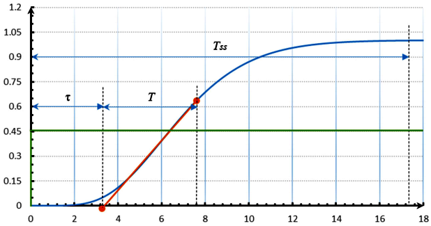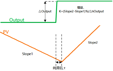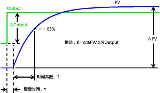 从开环响应的63.2%ΔPV,沿响应曲线向前做响应曲线的切线,切线与时间坐标轴相交。输出变化到交点为纯滞后时间τ,交点到63.2%ΔPV的时间为时间常数T。