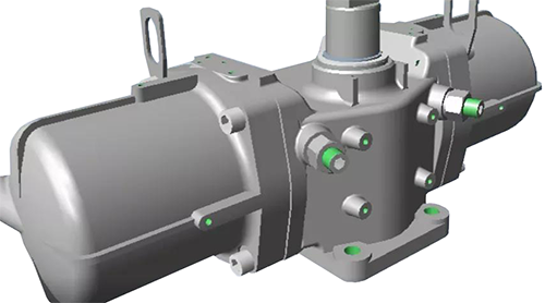 双缸单作用是集合单缸单作用及双缸双作用的优点,两端都是气缸,其中一个气缸中带有弹簧,当动力风中断时在弹簧作用下,阀门关闭或者打开;在联锁启动时,在动力风和弹簧双重作用下,快速关闭阀门。
