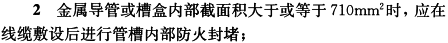 1.10.2条文第2款中要求当导管和槽盒内部截面积大于等于710mm2时,应从内部封堵。较大规格的电缆槽盒的内部封堵在工程实践中执行较好,需特别注意的是,部分内部截面积已达到需要封堵程度的小规格电缆槽盒在工程实践中未实施封堵的情况比较普遍。根据该规定并结合所查阅的相关数据(国标图集19DX101-1中的P6-42~P6-44页等),可推导出规格为SC32、JDG40、PC40、