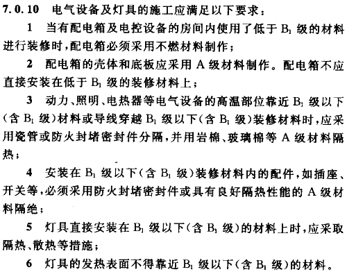 1.19 《电气验收规范》中第10.2.5.2条关于母线槽安装的防火封堵有要求,第18.2.2.3条对容量100W及以上的灯具,要求其“引入线应采用瓷管、矿棉等不燃材料作隔热保护”,这个隔热保护也是重要的防火保护措施之一,这个要求的内容应是来源于改版前的《建筑设计防火规范》第10.2.4条及《建筑电气照明装置施工与验收规范》 (GB 50617-2010)中第4.1.4条,区别在于:《建筑设计防火规范》及《建筑电气照明装置施工与验收规范》只针对卤钨灯和白炽灯泡,但《电气验收规范》则针对所有的光源,只要功率超100W即要求采用该防火保护措施,除非是敞开式灯具。个人认为本条规定值得商榷,对大部分冷光源来讲,该隔热保护措施相对偏保守,实际施工时可按《建筑内部装修防火施工及验收规范》(GB 50354-2005)中第7.0.10条中的有关内容执行:
