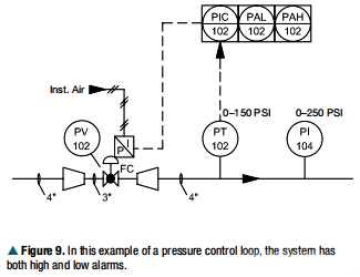 图9中的压力控制器PIC102旁边有两个符号-一个标为PAH,另一个标为PAL。这说明压力控制器有一个高压报警(PAH)和一个低压报警(PAL)。在P&IDs上对报警的描述可能因CPI的不同部分而不同;在一些部门,报警的细节在工厂的功能规范文件中列出,而不是在P&IDs上显示