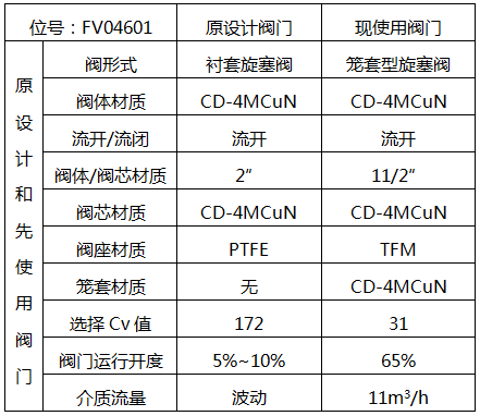 在实际运行过程中,也得到了验证:例如2021年3月11日,生产硫铵产品时,流量11m3/h,阀门开度65%;其他配方的产品生产,FV-04601运行也很稳定。原设计旋塞阀Cv值172,流通能力超出实际所需值5倍多,平时开度在5%~10%,可调区间太小,又内漏基本无调节功能,全靠手动阀控制工艺指标。阀门Cv值选择太大,也是导致阀门长期小开度运行和无法准确控制的根本原因。