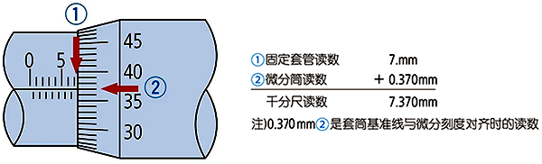 带游标刻度的千分尺在套管基线的上面有游标刻度,此时的读数方法如下图所示: