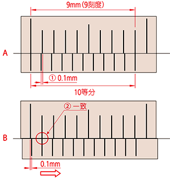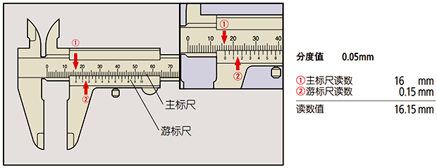这意味着,随着卡尺量爪打开,每次连续移动0.05mm均会使后续游标尺线与主标尺线重合,所以计数单位为0.05mm。或者,可使一个游标分格比主尺的两个分格短0.05mm,以形成长游标尺。这使刻度更易读,但原理和分度仍相同。