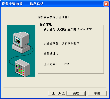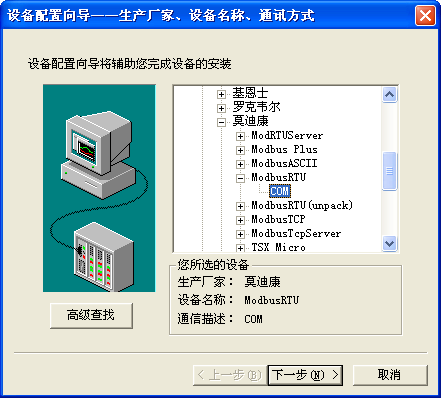选择PLC选项下的--莫迪康--ModbusRTU--com,单击“下一步”,打开如图: