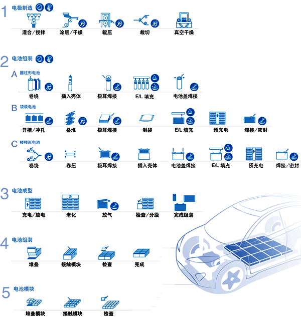 电池生产产细分为电极制造、电池组装、电池成型、电池组装和电池模块五个大的生产环节,如下图所示: