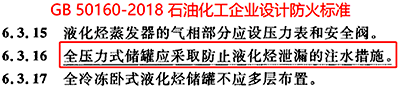 此后,关于全压力式储罐应设置注水系统的强制规定,一直被标准延续到今天,甚至将其作为一个重大隐患而提出,可见其备受重视的程度。