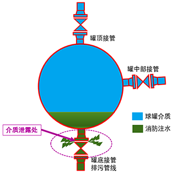 其次,球罐的介质密度不能比水大,换句话说,注入球罐内的水必须要流入到球罐最底部,只有这样才能将介质从泄漏处顶开,用水来代替介质从泄漏点泄漏出去,从而将介质牢牢限制在容器内。
