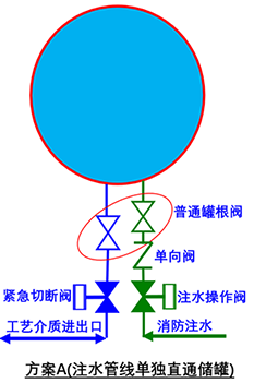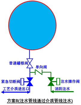 方案A:注水管线采用独立的一根管线,直接和储罐连接,管线上设置罐根阀+单向阀+注水操作阀(可远程操作),其中罐根阀常开,注水操作阀常关。方案A的优势在于注水线不受工艺介质管线的影响,注的消防水能直接通到罐内,并且注水线的管道尺寸和压力等级可以单独设计,注水量能得到保证。方案A的劣势在于,在球罐上多了一个开孔,并且相连接的管线阀门法兰都成了潜在的泄漏源。
