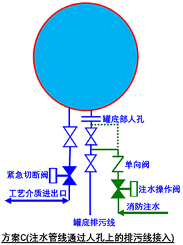 方案C:注水管线通过接入罐底部人孔盖上的排污管线实现注水。该方案在很多企业里确实存在,方案C的优势在于,既避免了罐壁上开孔,也不受工艺介质管线状态的干扰。看起来相对比较完美,但是这种方案的劣势在于人孔盖上的排污管线,一般和切水管线都是同一根管线,所以管道的尺寸一般不会太大,常见的DN50-DN80之间,注水量很可能是不满足的,所以采用方案C,前提是必须注水量计算通过,否则无法适用。