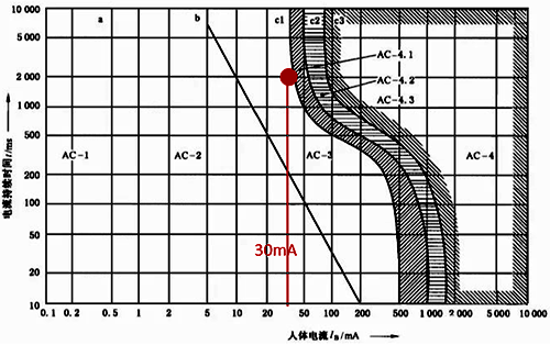 图1为IEC 60479-1:2018“Effects of current on human beings and livestock-Part 1 :General aspects”,即电流对人和家畜的效应 第1部分:通用部分。理论上,AC-1、AC-2、AC-3区相对安全,但是,该图是通过人体、动物、尸体试验得出的,反映的是概率,且以欧美人为主进行的试验,是否完全适合东亚人,不敢断言(因为我们没有类似的试验研究)。因此,采用30mA上限值相对比较安全。