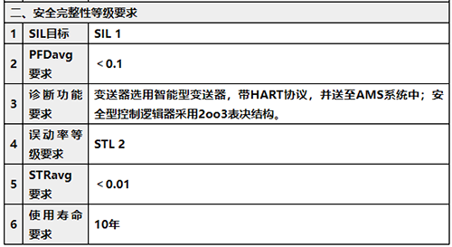安全要求规格书一般包括通用性要求、安全功能要求及完全完整性要求。SIS通用要求包括的设计标准、运行环境、EMI/RFI(电磁干扰/射频干扰)要求、EMC(电磁兼容性)要求等,这些内容可从SIS技术规格书中获取。SIS需根据相应的标准规范进行设计,在合适的环境中运行,避免电磁干扰影响安全功能的执行。SIF的通用要求包括运行模式要求、失效模式、MTTR/MRT要求、使用寿命要求、诊断功能要求等,这些是每个SIF的共性部分。安全功能要求是描述SIF回路执行什么样的安全功能,这部分内容做为SIS设计的输入条件。安全完整性等级要求是描述SIF回路如何更好的执行安全功能,对SIF回路的SIL等级、目标失效量、周期性检测等提出要求,这部分内容做为SIL验算的输入条件之一。