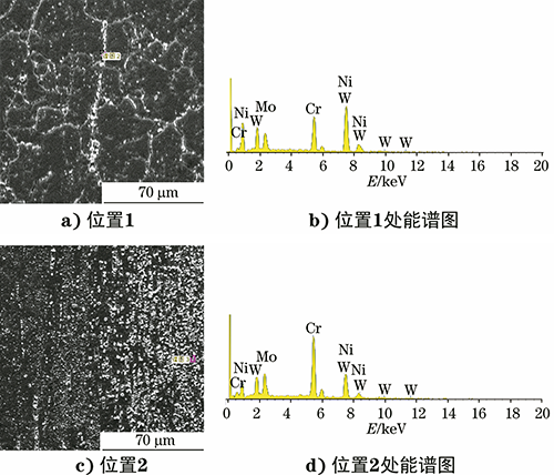 对断裂和未断裂铠装热电偶保护管进行能谱分析(见图4),发现断裂保护管的晶界和晶粒间都有大量的析出物,晶粒间主要为颗粒状析出物,晶界上除了有颗粒状析出物,还有棒状和链状析出物,说明组织内有多种析出物同时析出。经过能谱分析可知,析出物主要为富含钼元素和钨元素的析出物,其中,图4c)为靠近保护管内壁位置的微观形貌,有大量的白色颗粒物,钼元素和钨元素的含量偏高,铬元素含量略有增加,而镍元素含量与基体相比少很多,可见材料已经发生成分偏析。