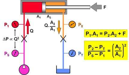 由于油缸面积比的不同,在保持力平衡的前提下于小腔而言相当于压力放大器的作用;因而大腔的压力变化,会在小腔得到一个放大和强化;而对于大腔而言又是一个流量放大器,对于下游容腔,流量的变化又会对应为压力的变化;这同样也会又传递到小腔进一步放大了这种变化。因而这会相对容易演变成压力瞬变。
