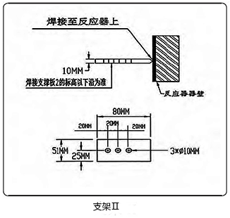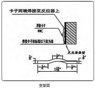 ③支架III:每床层8个,支架II间均匀分布,用于热电偶固定。这种方案只要前期设计准确,安装是比较方便灵活的,且预埋件体积小,数量少,可有效减小焊接对反应器器壁堆焊层的影响。