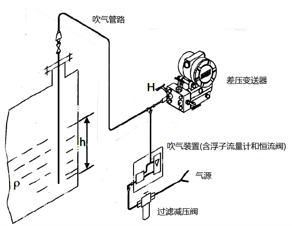 吹气式液位计可对敞口或密闭容器内的液体进行测量。除吹气管与被测介质接触外,吹气装置主要设备和液位变送器的测量元件均不与被测介质接触,结构简单可靠,从而保护了测量元件,减少了仪表的维护量,增加了测量的可靠性。吹气式液位计除了能测量普通液体的液位外,特别适用于恶劣环境下,例如腐蚀性液体、黏度较大液体、易结晶液体、高温液体的液位,广泛应用于石化企业中。