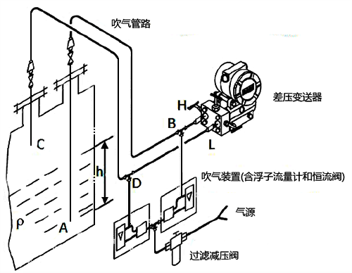 吹气式液位计主要由两部分构成,一部分为吹扫装置,由空气过滤减压阀、小流量控制器与玻璃转子流量计构成,另一部分由差压变送器、波纹管防污隔离阀(根阀)和伸入设备的吹气管组成,其工作原理如图1。吹气检测方法是将吹气管插入到设备的不同深度,然后将压缩空气通过过滤减压阀后,均匀地进入吹气管中,连续不断地向被测介质中吹入。当吹气管下端液面位置的静压小于吹气管内的压力时,压缩空气经吹气管下端的气泡均匀冒出,差压变送器上获得的差压值即为两根不同深度的吹气管对应位置的静压值,根据设置的吹气管插深和差压值,获得需检测的各参数。基本公式为p=ρgh,其中ρ为容器内介质密度,g为重力加速度,h为吹气管插入的深度。