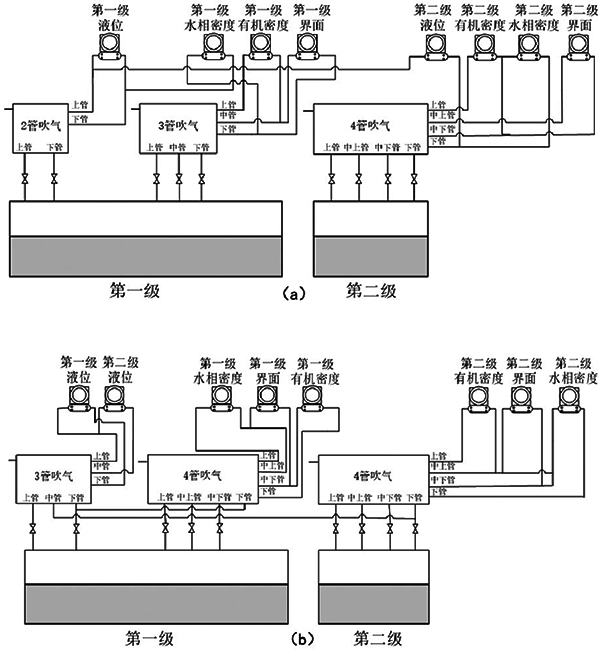 在建后处理项目中的混合澄清槽需检测两级相关参数的,每级检测的参数均为水相密度、有机相密度、液位和界面,采用吹气测量法进行检测。测量装置由吹气管、吹扫装置和差压变送器3部分构成,检测到的差压信号送至控制系统运算后显示。但是,其检测系统的设计有两种,如图2所示。一种是由二管、三管和四管3个分体式吹气仪表组合使用方式,另一种是由三管、四管和四管的分体式吹气仪表组合使用方式,都能够满足工艺参数的测量。