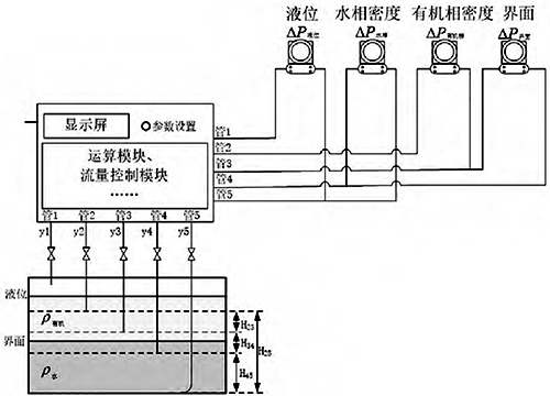 当液位高于y2管,界面低于y3管,即y2管与y3管末端均浸入有机相中,此时可测得有机相密度ρ有机=∆P有机/(H23×g)。当界面高于y4管时,ρ水=∆P水相/(H45×g)。