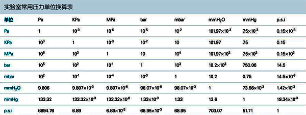 他们Pa, kPa, MPa, mbar, bar, mmH2O, Psi之间的压力换算方式如下表:
