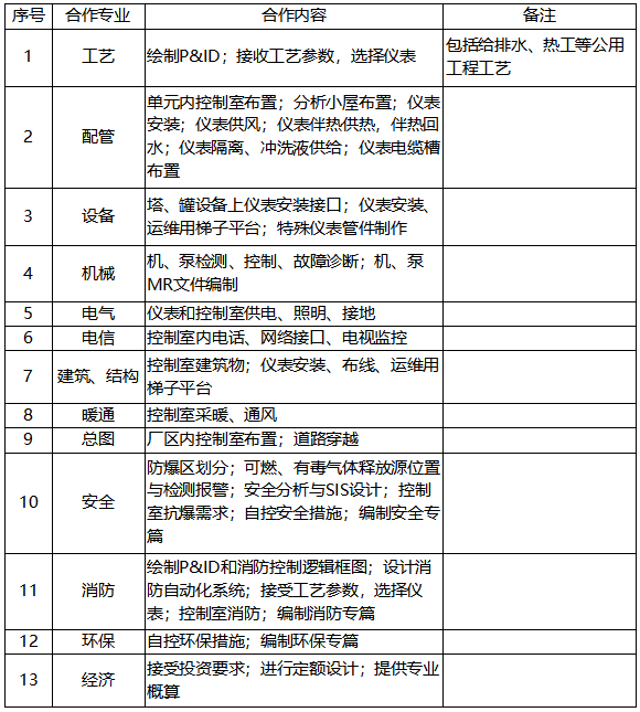 自控设计合作贯穿于自控专业与工艺专业、配管专业、设备专业、机械专业、电气专业、电信专业、建筑/结构专业、暖通专业、总图专业、安全专业、消防专业、环保专业、经济专业等之间,彼此牵制彼此配合。本文详细介绍自控工程设计之自控专业与电信、建筑/结构、暖通、总图、安全、消防、环保、经济专业的设计合作。
