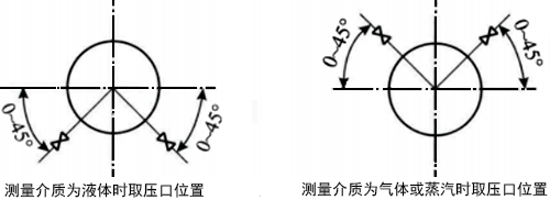 取压口一般设置在法兰、环室或夹持环上,当测量管道为水平或倾斜时取压口的安装方向如下图所示。它可以防止测液体时气体进入导压管或测气体时液滴或污物进入导压管。当测量管道为垂直时,取压口的位置在取压位置的平面上,方向可任意选择。