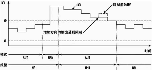 所谓的上下限限制扩大功能就是为了防止出现这种输出突变而暂时将MH和ML的范围扩大的功能;在手动时,当MV>MH时,将与MV相同的值作为暂时扩大的输出上限设定值使用,当MV<ML时同样暂时设定输出下限值;这样,当控制块由手动向自动切换时,输出值不会发生突变。
