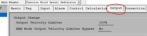 Output Velocity Limiter:可以设置从0到MV刻度量程范围内的工业单位数据或%值,默认是100%。